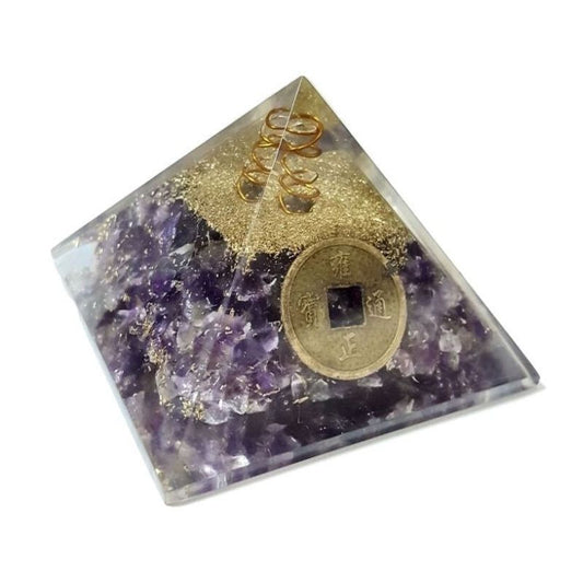 Pirámide Orgón Amatista con Moneda Feng Shui 7 x 7 cm x lado x 5.5 cm alto