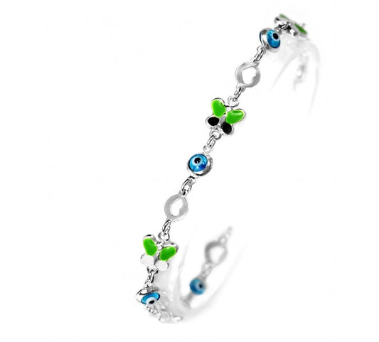 Pulsera Niños Ojo Turco y Mariposas Plata 925 Cristal y Esmalte. Hecho en Turquía