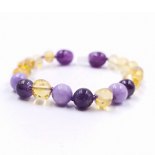 Pulsera Ámbar para Bebé con Cuarzo y jade Amatista. Certificado Dentición